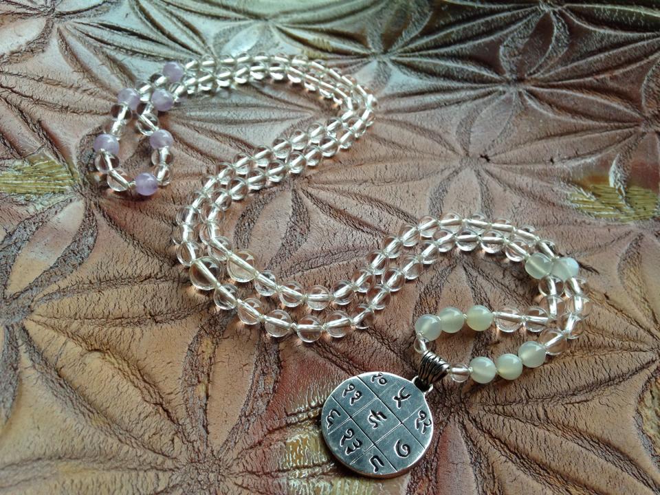 above: For a client who had a vedic amulet to wear, and wanted more than a leather cord with which to string it, together we formulated a joyful, nurturing and protective mala of lavender amethyst, clear quartz and moonstone