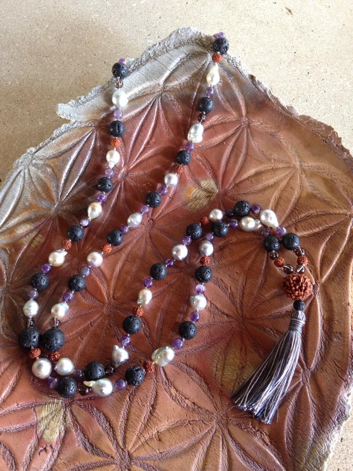 above: For a client who had some beautiful baroque pearls which he had purchased from a dealer, this kingly mala of lava rock, amethyst, smoky quartz and rudrakshas surfaced.